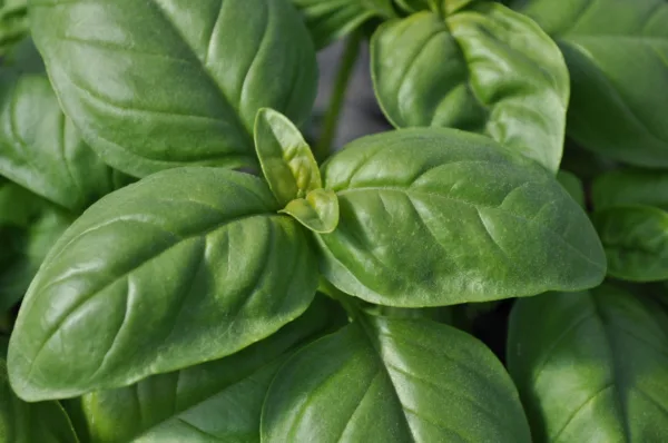 Genovese Basil is often referred to as Italian Basil because it is a common ingredient used to add flavor to Italian food. Chances are that this is what you will find most prominently at your local grocery store or farmers’ market. This variety has dark green, shiny leaves that tend to curl under as the leaves grow in size. The plant will produce long stalks of small white flowers. In an herb garden, the flowers should be pinched off to promote more leaf growth. This variety tends to produce a very high yield of leaves, especially when the flowers are pinched. If you let the flowers bloom, the leaves will lose most of their flavor and the plant will go to seed and die off.