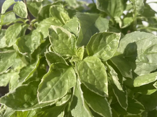 A striking variegated basil with creamy white and green leaves, upright growth, and a clean, lemony sweet flavor. Naturally non-flowering, it provides continuous harvests, thrives in containers, and adds both culinary value and ornamental appeal.