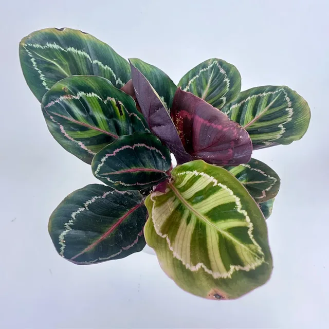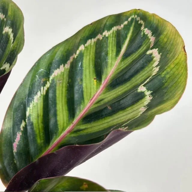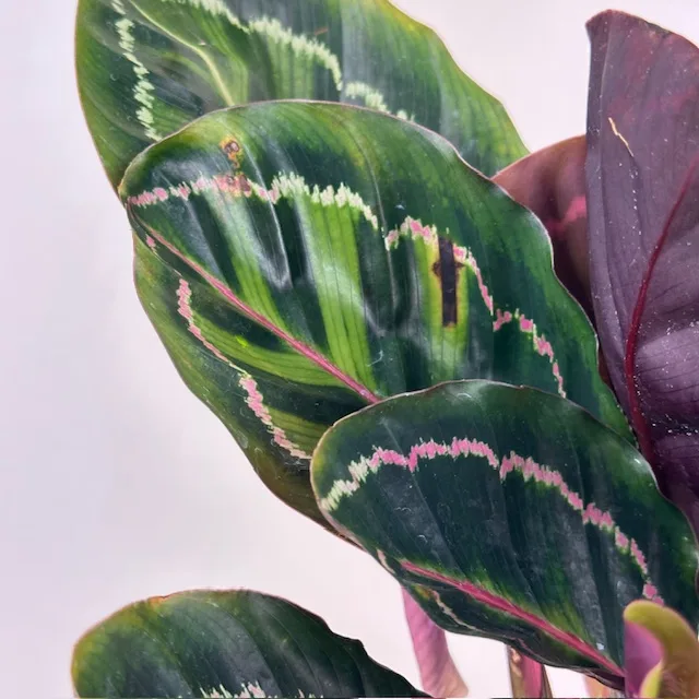 Calathea ‘Dottie’ is characterized by its rich, dark purple leaves and bright pink markings. Bright, indirect light is best, as well as consistently moist soil. But be sure the soil does not become soggy, and do not let the plant sit in water. Dottie loves humidity and moisture, making it a great plant for a bathroom if given adequate light!
