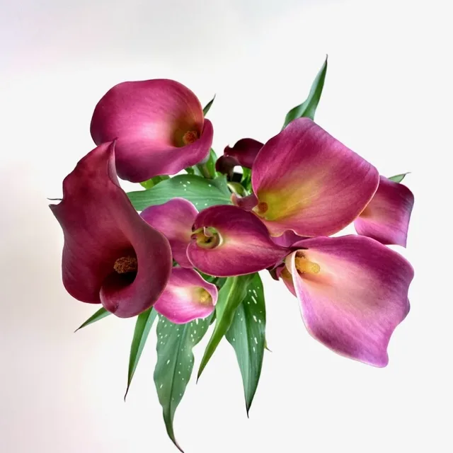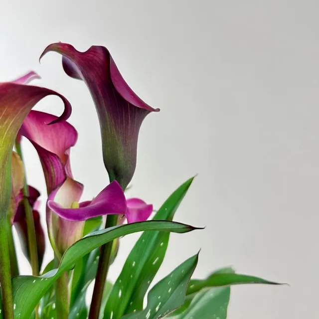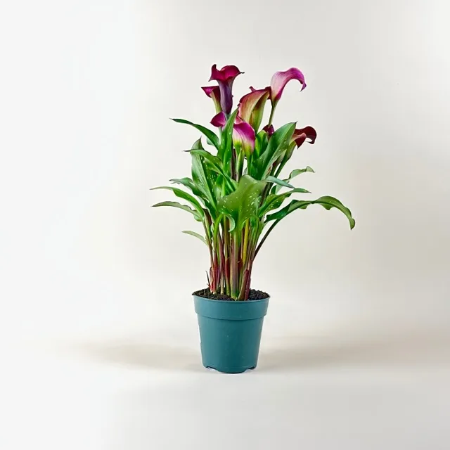 Callas are made up of a “flower” or bract (in a number of colors) which surrounds a central spike or spadex. The foliage is green and sometimes very glossy, arrow shaped or lanceolate and often spotted. Colors can range from red, orange, yellow, pink, purple, white, black and others in between! Potted varieties can be grown indoors as a seasonal houseplant if given bright light. Keep soil moist but not soggy for best results.