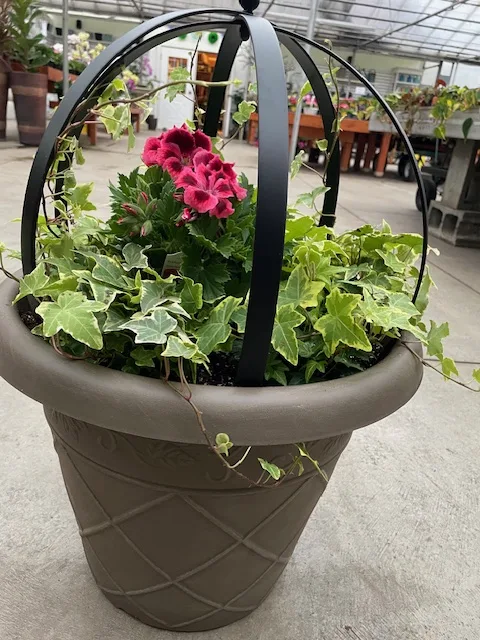 An all season, embossed 14in pot, in a light tan color will be the base. A large round Wrought Iron Topiary is positioned in the center. Old fashioned english ivy surrounding the Topiary and ready to spread! A Hole in One area is created to seasonally switch out any 6in flowers, making this an April to Nov. porch pot.