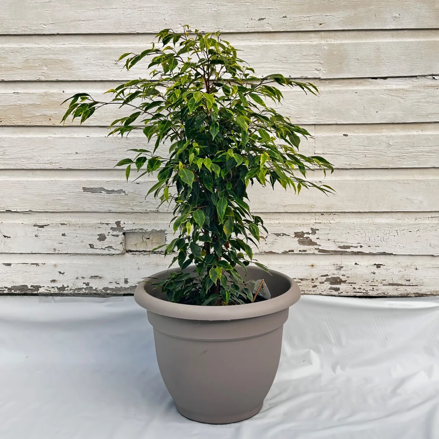 The Ficus benjaminas of yesterday are gone! Say hello to Cling-On ‘Anastasia’, a benjamina that has been bred to have leaves that resist dropping; they literally cling to this ficus. ‘Anastasia’ has slender, arching branches that carry shiny, variegated leaves of light and dark green. She can take on the form of a small tree, or grow as a multi-stemmed plant with a bushy habit. In order to keep your ‘Anastasia’ showing her most prominent variegation, she needs to be given plenty of bright light, such as can be found in a west- or south-facing window.