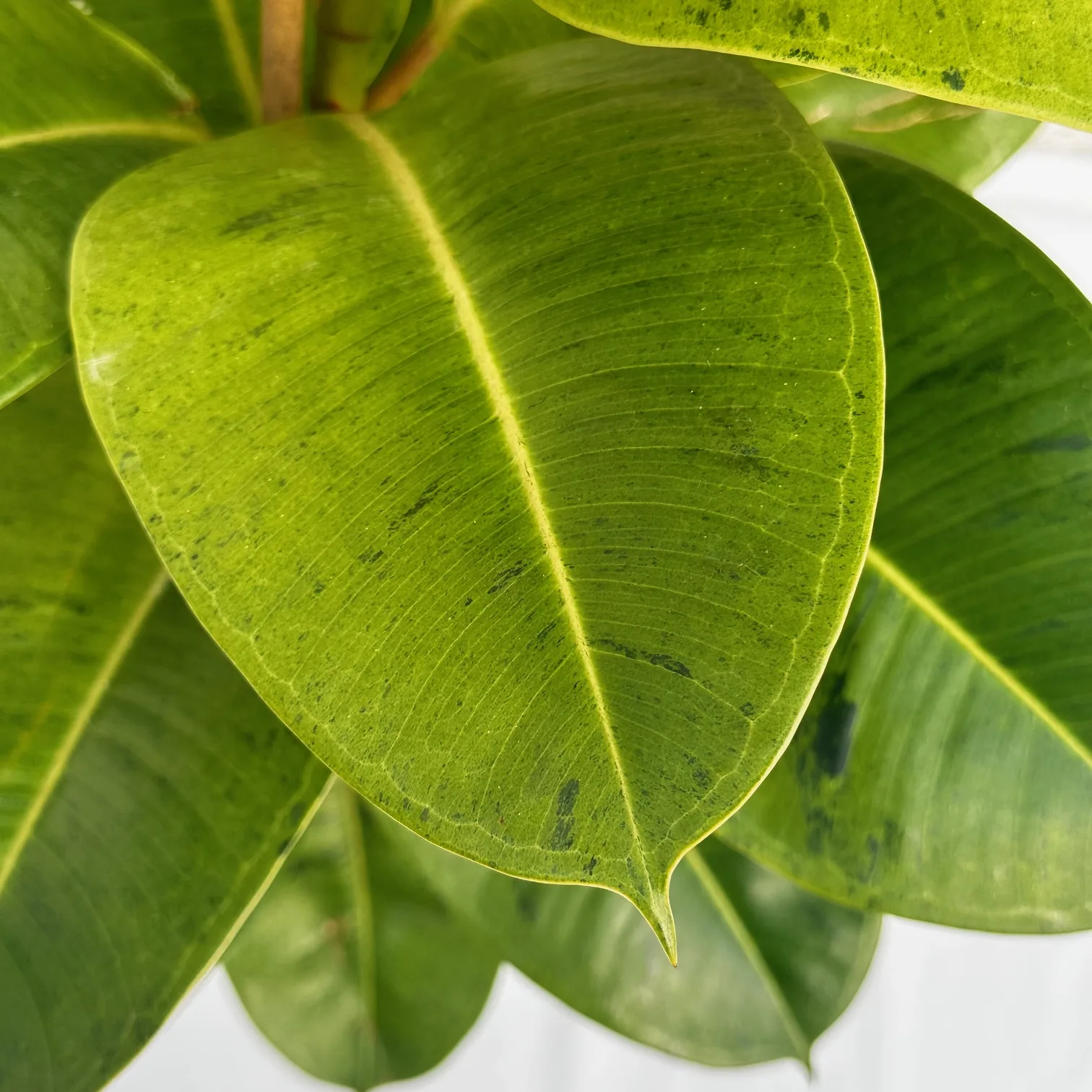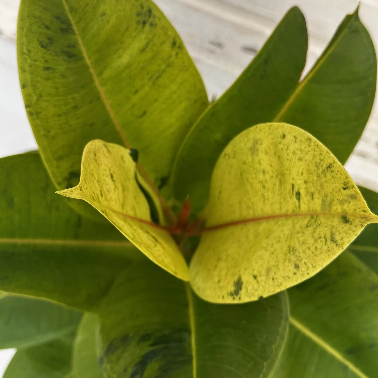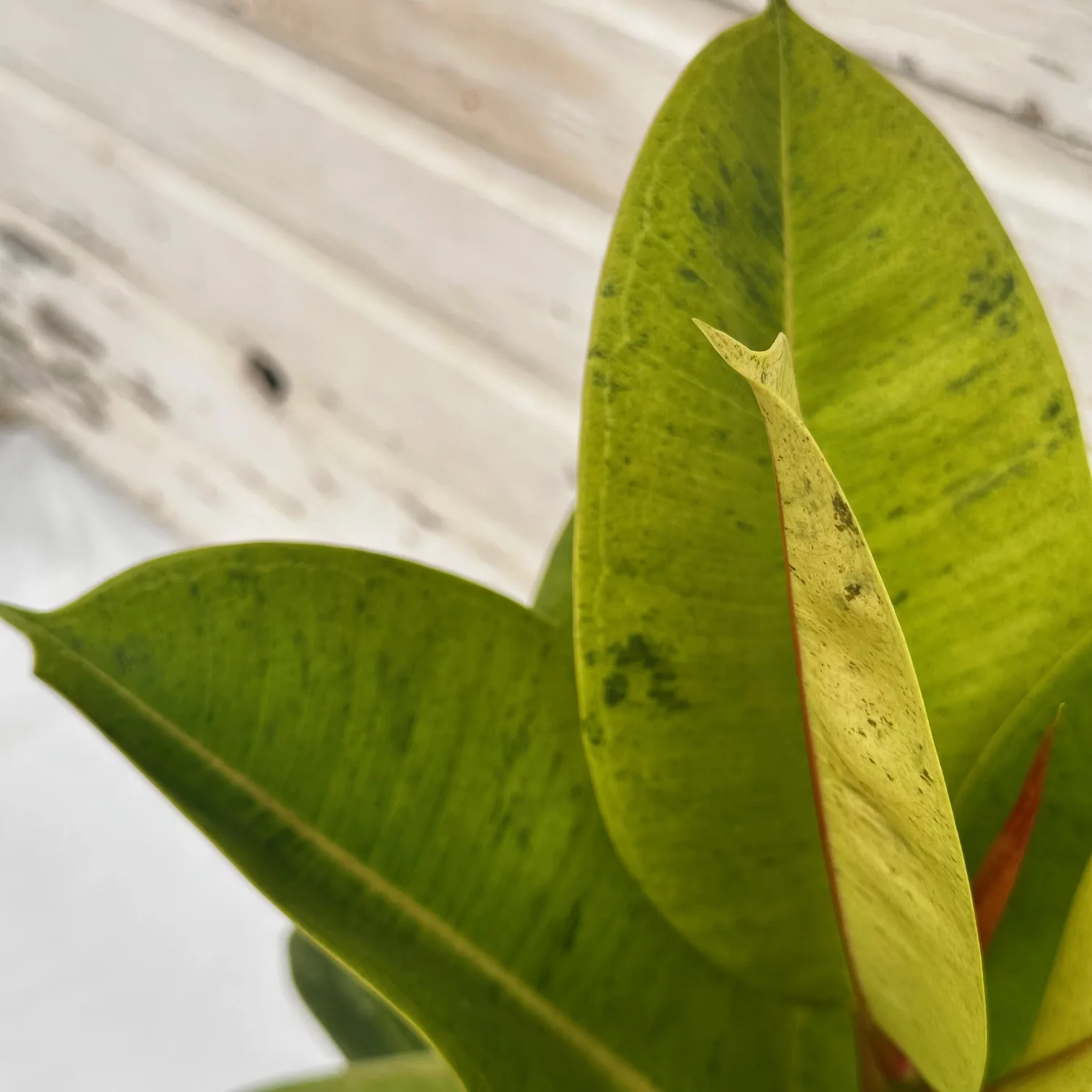 Ficus shivereana is a half-breed of Ficus elastica (Rubber Plant), and features exceptional broad shiny oval leaves with pointed tips. The leaves are variegated with cream, white and green freckled patterns. Every leaf is different from the other and often will include some pinkish-orange speckles as well. It is an easy-care houseplant but does take some time to adjust to a new environment. Bright, indirect light is best, and moist (but not soggy) soil.