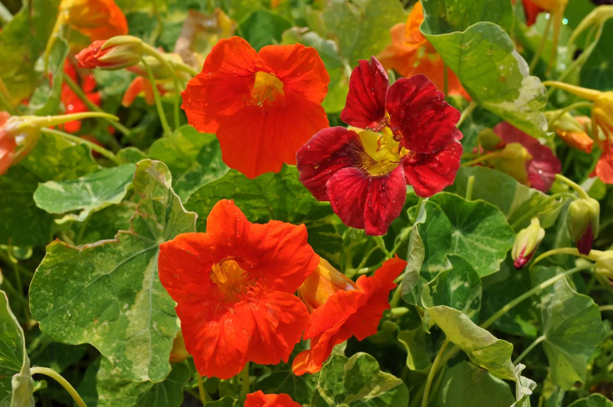 Attractive variegated foliage and a mix flower colors including gold, orange, salmon, and mahogany are borne on compact plants in summer. Nasturtiums are a lovely addition to the gardens edge, container, or mixed bed. Attractive to hummingbirds, these easy to grow plants will often self sow. Add young leaves and flowers to salads for a delightful peppery taste.