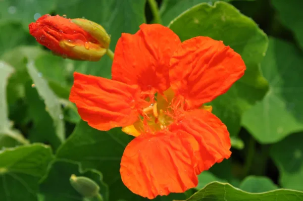 Bright semi-double blooms in colors of yellow, orange and red that bloom in summer atop green foliage. Nasturtiums are a lovely addition to the garden’s edge, container, or mixed bed. Easy to grow, and will often self-sow. Add young leaves and flowers to salads for a delightful peppery taste.