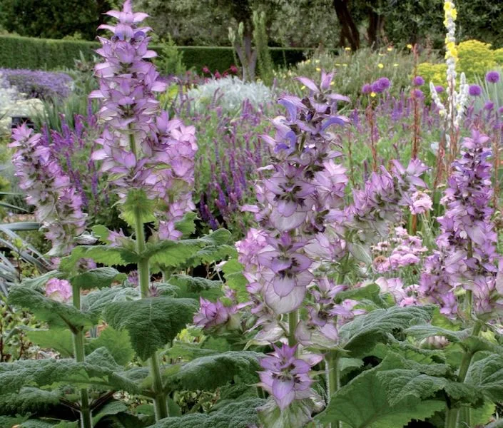 Fragrant pink flowers in the summer. The flavor is milder than most sages. Gray-green leaves are wrinkled and strongly scented. Try it chopped and sprinkled over a fresh omelet or with poultry. Best treated as an annual but may self-seed if flowers are not removed.
