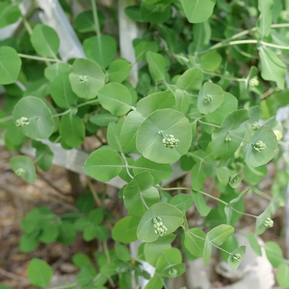 This wild-looking plant is actually native to North America. Each season, it begins like any other honeysuckle, with typical dusty green leaves. As the season progresses, flower buds pop out like saucers. These rounded bracts look a lot like eucalyptus, but the flowers at the center feed native pollinators like hummingbirds! They turn into red berries in the fall, but won’t become a nuisance like other honeysuckles. Due to its size and interesting seasonal changes, it makes an incredible specimen.