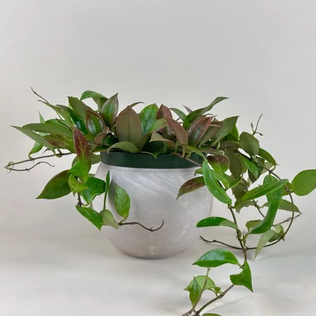 Sunrise Hoya is sought after for its stunning venation and leaves that turn a rich maroon red under high sunlight. Small, cream-colored blooms are highly fragrant. Hoya ‘Sunrise’ is a hybrid between Hoya lacunosa and Hoya obscura. Easy to grow and adaptable to lower light locations. Soil should be evenly moist, but do not let the plant sit in water.
