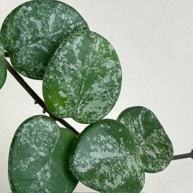 Say hello to ‘Mathilde Splash’, a stunning hybrid hoya with no shortage of freckles and speckles! ‘Mathilde’ sends out dainty vines of ovate, succulent leaves of medium green that are heavily splashed with spots of silver. ‘Mathilde’ is known for its easy-going nature, growing quickly for beginners and seasoned plant parents alike. Given the right conditions, ‘Mathilde’ will reward you with clusters of fragrant, fuzzy white flowers. Be sure to leave the spent flower peduncles intact, as this variety of hoya is a rebloomer.
