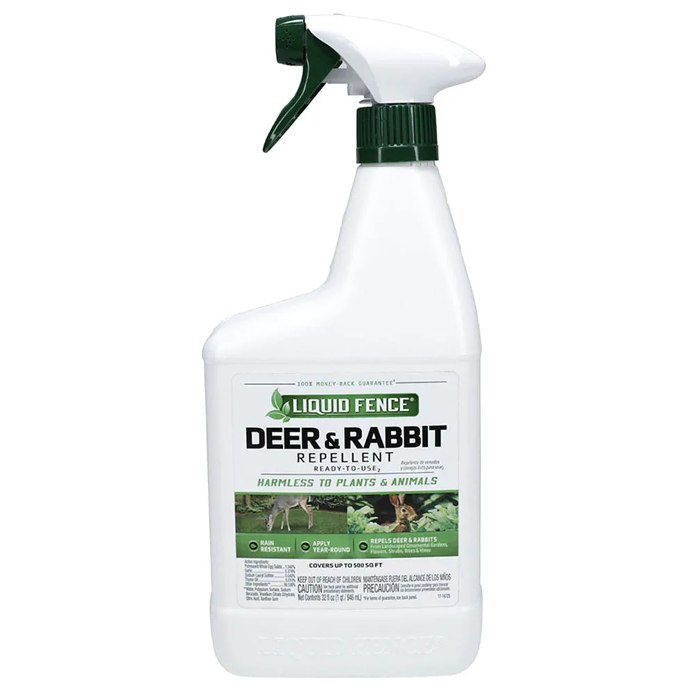 Liquid Fence Deer & Rabbit Repellent stops deer and rabbit damage. It works on scent, so deer and rabbits don’t even have to take a bite to be repelled. Because the animals’ natural aversion to this scent will never diminish, this product DOES NOT have to be rotated with other repellent brands.