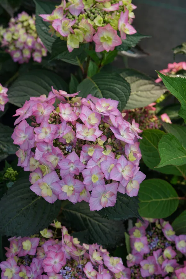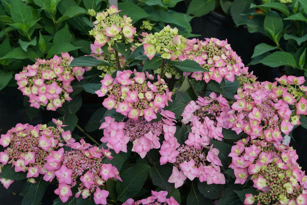 One look at Let’s Dance Can Do hydrangea tells you it’s beautiful – but there’s more to this innovative new hydrangea than that. It has the unique ability to create flower buds along the entire length of the stem instead of only at the top like other big-leaf hydrangeas. That means that even if winter does its worst and kills back a portion of the plant, there will still be flower buds to open in early summer. Let’s Dance Can Do also reblooms quicker than others: in other words, you won’t have to wait until fall to see the new flowers. They are lacecaps, but the size and quantity of the showy sterile florets obscures the tiny fertile florets. Flowers are a luscious strawberry pink in neutral/alkaline soils and a lovely lavender in acidic ones.