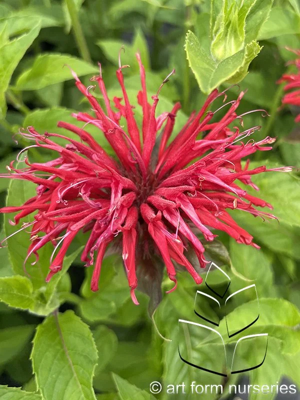 A cross between Monarda ‘Marshalls Delight’ and Monarda ‘Jacob Cline’, this hardy hybrid produces oversized red flowers with pink undertones. Green foliage with good powdery mildew resistance. Grows best in moist well-drained soil.