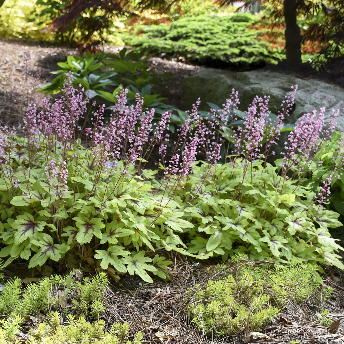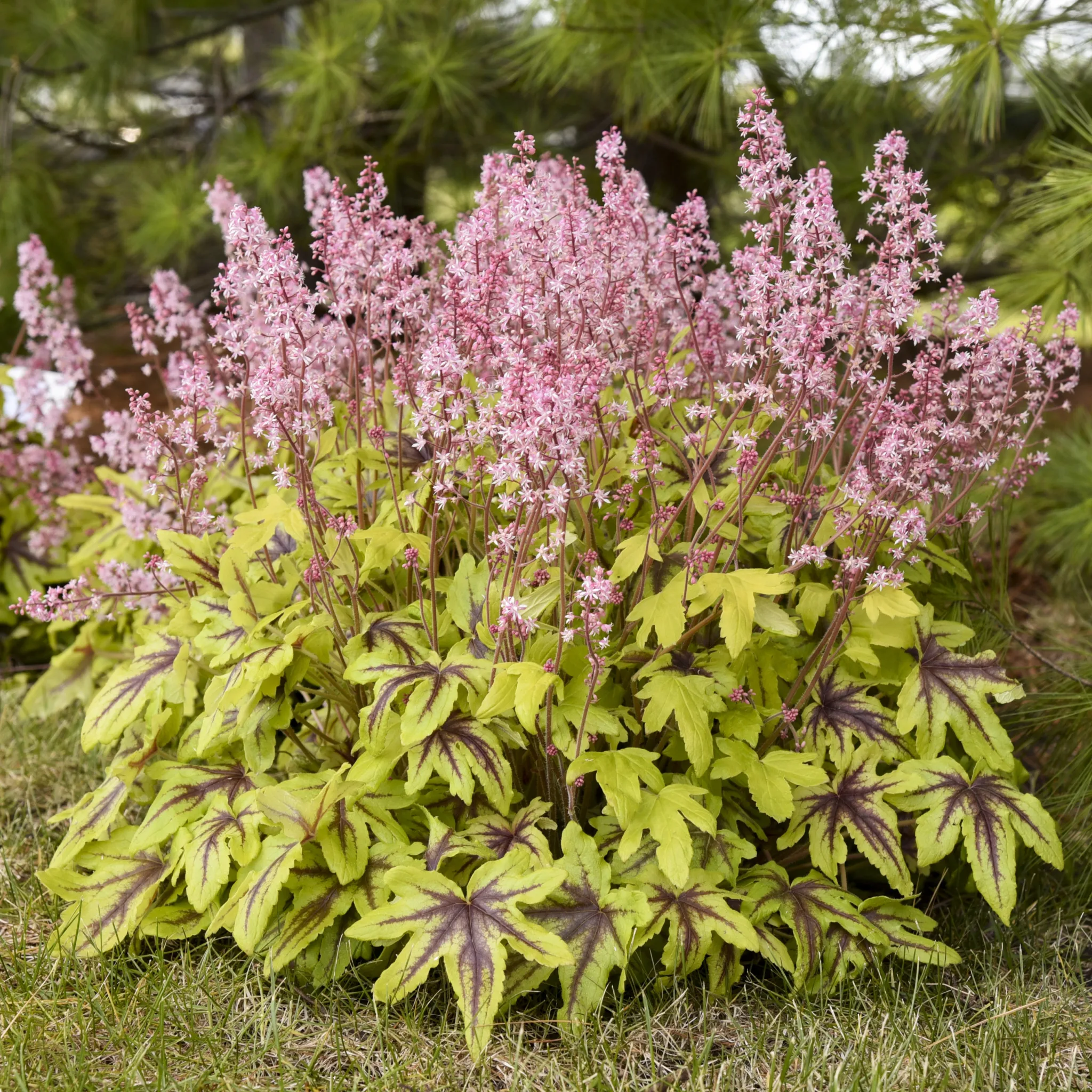 Heucherella is a hybrid genus produced from a cross between Heuchera and Tiarella. From Heuchera they gain the many different foliage colors and textures, while Tiarella add deeper leaf lobes and serration, as well as their signature central leaf blotching. Heucherella are sterile hybrids, and so typically have longer bloom seasons than either of their parents.