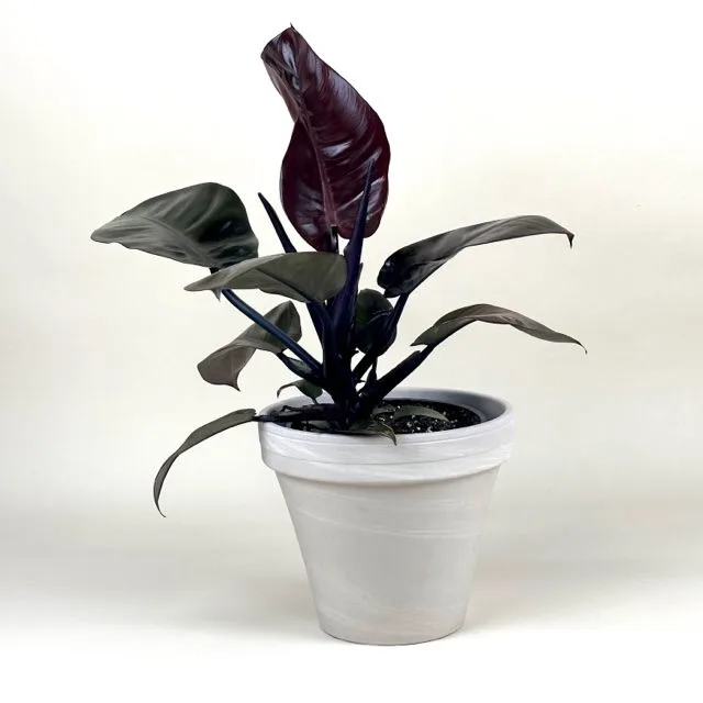 Philodendron ‘Black Cardinal’ has blackish-green, broad oval leaves. However when new leaves emerge, they are initially burgundy red, but as they mature they become a dark green, turning to almost black. Black Cardinal is a mounding variety. Allow the top two inches of soil to become dry to the touch before watering, and do not allow the plant to sit in water. Soggy soil can cause root rot. Bright, indirect light is best but be sure to keep out of direct sunlight as it can burn the leaves.