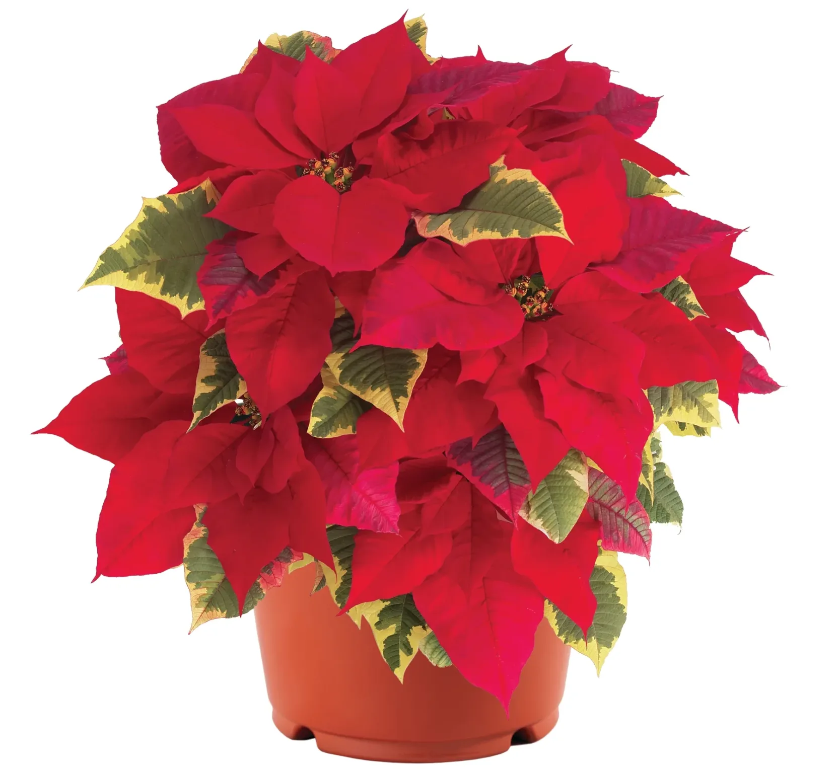 Poinsettias are a widely-used traditional Christmas plant and are available in a variety of colors ranging from the traditional reds to white, pink, salmon, and a whole host of novelty varieties too. Poinsettias can be easy to take care of if given bright light and consistent moisture without overwatering. Avoid cold drafts such as frequently used doorways and also heat sources such as heat ducts or radiators.