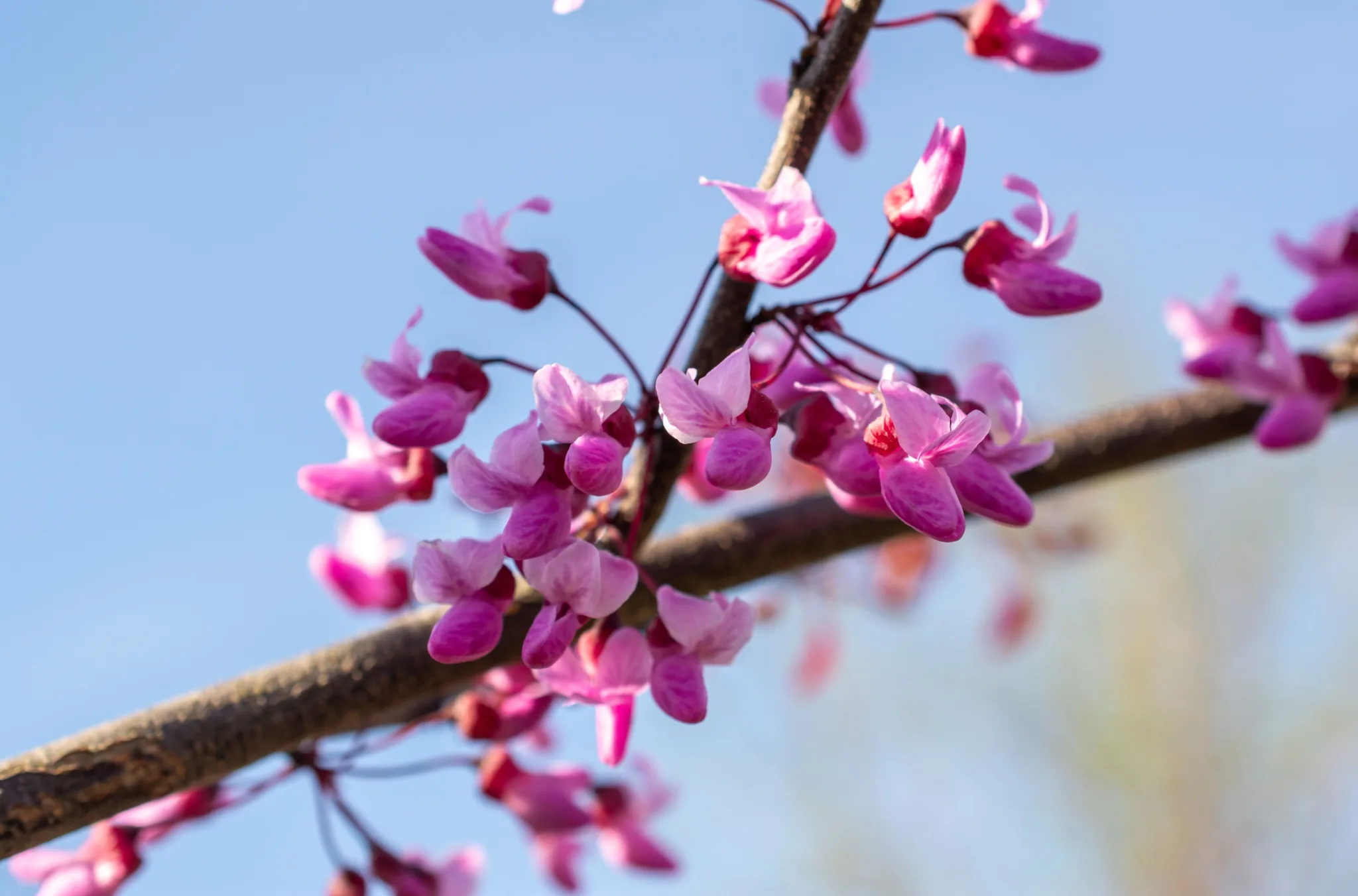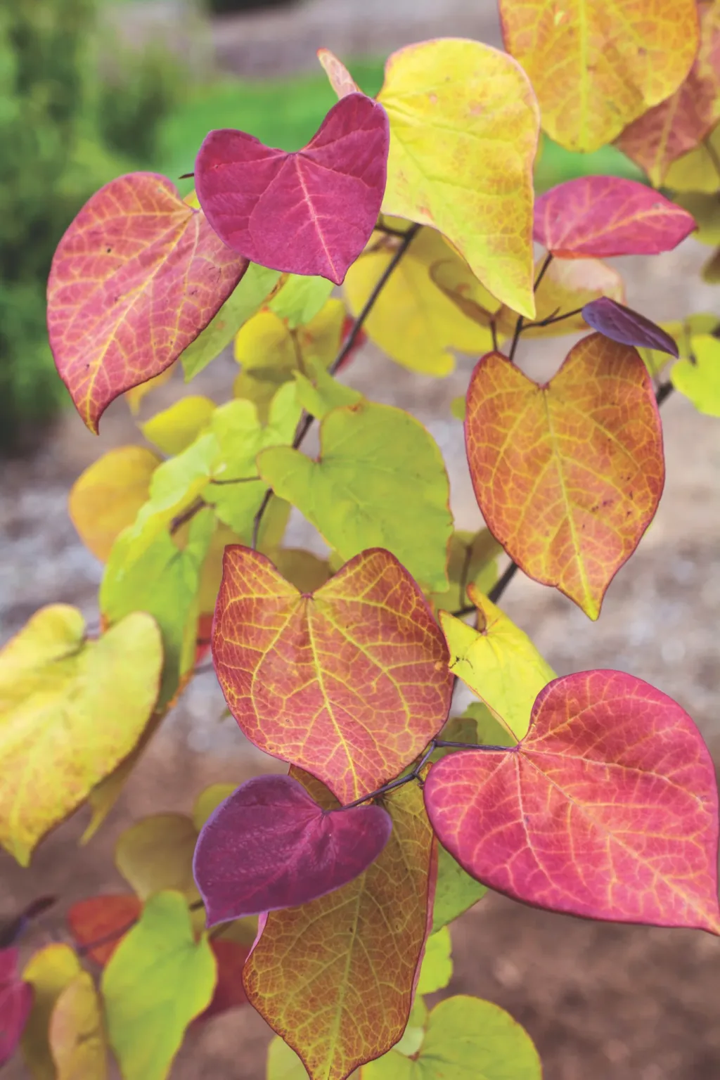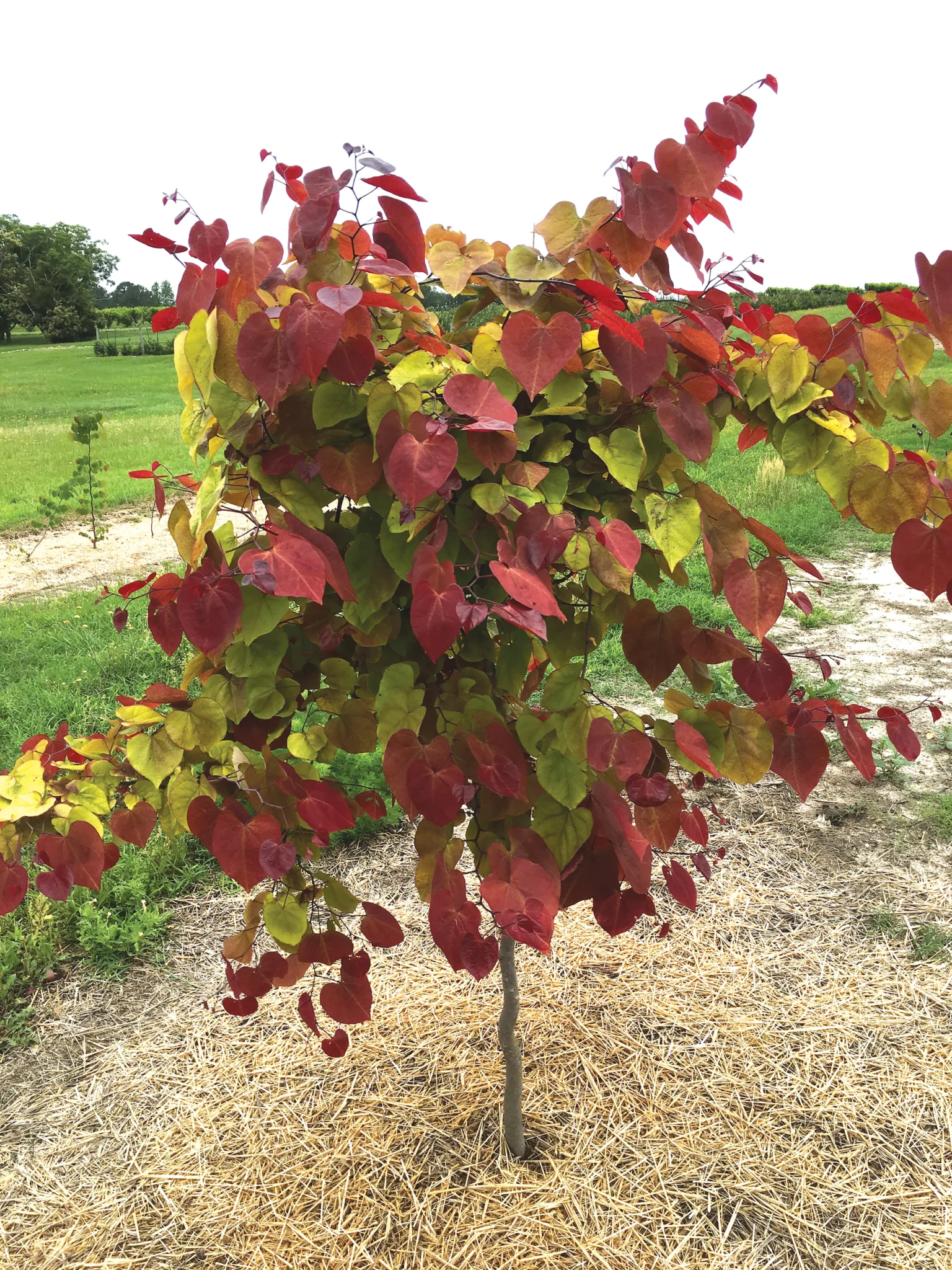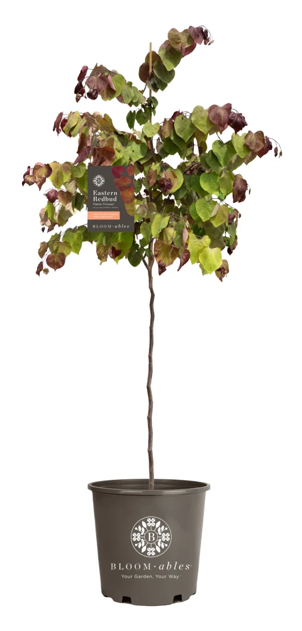 Flame Thrower Redbud blooms with a profusion of pink pea-like flowers in spring on bare branches before the leaves emerge. The heart-shaped, glossy foliage is a stunning rainbow of colors through the season, first emerging red and gradually turning shades of orange, yellow and green as it matures. The mix of colors is persistent from spring through fall, often showing four to five shades on a single branch. Grow in full sun to part shade in well-draining soil for best results.