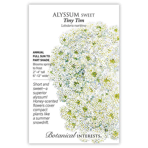 Nothing adds more delight to summer days than the gentle fragrance of sweet alyssum. ‘Tiny Tim’ is compact and always covered with flowers. A wonderful ground cover, it blooms all growing season with no need to shear back at any time. Alyssum withstands drought and heat, while attracting pollinators. It is an ideal rock garden plant, and gracefully spills over edges of containers. Edible flowers have a mild, grassy/mustardy flavor; the clusters make a charming garnish to salads and desserts.