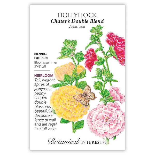 One of the most popular hollyhocks of all time, ‘Chater’s Double’ was named after the English horticulturist, Chater of Essex, who developed this variety in 1880s. Colors include golden-yellow, rose, maroon, salmon-pink, scarlet, and white. Flowers have a long bloom period and are edible! Fairly drought tolerant but performs best with ample moisture and rich soil. Hollyhock flowers are edible, but very bland; however, the large, colorful petals are lovely garnishing salads or desserts. (The flower’s central disk, while edible, can be bitter.)