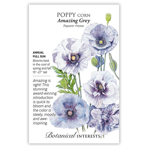 The beauty of ‘Amazing Grey’ is beyond compare! Crepe-paper like blooms unfurl into single and half-double blooms, each unique. Bred over 18 years from a single bloom in the Mother of Pearl poppy blend, the breeder isolated the purple-grey flowers, although you may see an occasional burgundy bloom. A practically care-free annual and a pollinator favorite, these poppies reseed making them ideal for naturalized areas. A 2018 Fleuroselect Novelty award winner. Drought tolerant and deer resistant.