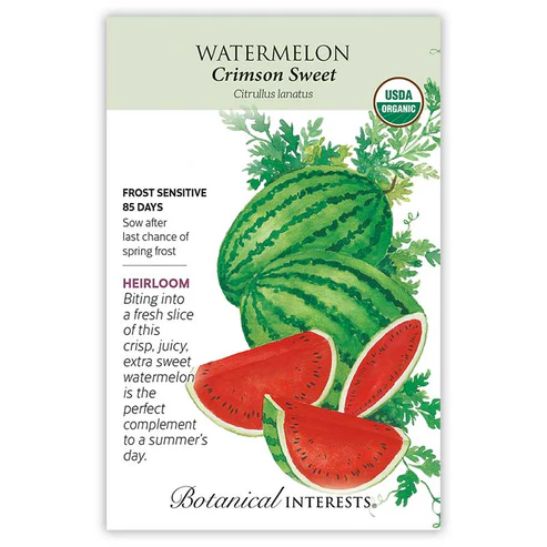 Watermelon—the word brings to mind the long, lazy days of summer, picnics, and barbecues. ‘Crimson Sweet’ is a high-quality old standard of home gardens, weighing about 20–25 pounds with bright crimson flesh. With just a little care, it can be easily grown in northern climates; see inside of packet for details. Bottom turns ivory when ripe. Resistant to Fusarium wilt and anthracnose.