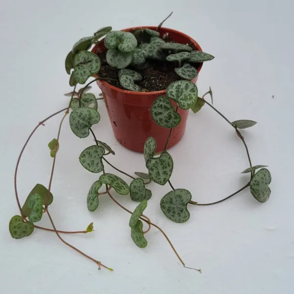 The String of Hearts plant is an evergreen, trailing succulent vine that is easy to care for, attractive and very unique! Long-lived and fast-growing, the vines can hang down for several feet once they mature. The heart-shaped, grey-green leaves have an attractive marbled pattern and the thin vines are a distinctive shade of purple. Not big and showy, the pale magenta flowers are still interesting enough as they grow to be about an inch long, tubular with a bulbous base and form into enclosed beads, giving this plant another of it’s common names- the rosary vine. Bright but indirect light will be best for this plant, and be sure to let the soil dry in between waterings, then give a deep watering. Do not let the String of Hearts sit in water.